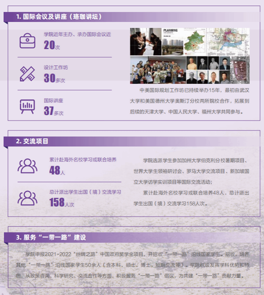 我院围绕厚基础、宽口径、高水平、强能力的人才培养目标,依托学校齐全的学科门类和深厚的人文底蕴,培育具有“人文化、数字化、国际化”综合素养的创新人才。学院“国际化”办学具有悠久历史和传统渊源,自1986年开始与荷兰国际地理信息科学与地球观测学院(ITC)开展合作;近年来,又与哈佛大学等15所海外院校和科研机构建立合作关系,合作范围仍在不断拓展。经过多年的发展,我院逐渐形成以建筑学中外合作办学项目(中英班)为特色,以项目合作交流为抓手的国际教育、交流体系。学院致力于服务国家“一带一路”倡议,助力发出“中国声音”,讲好“中国故事”。近年学院本科生、研究生毕业生出国出境留学比例和留学生人数均在全校名列前茅。2022年10月,我院被评为首届“武汉大学国际化建设先进单位”。