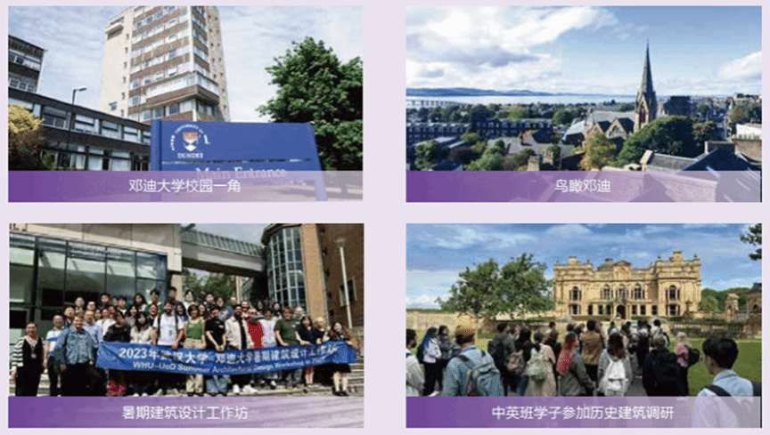 2013 年 3 月,经教育部批准并备案,武汉大学与英国邓迪大学合作开设建筑学专业(专业代码 082801H)“中外合作办学项目”(以下简称 “中英班”),项目批准书编号:MOE42UK2A20131391N,由我院负责具体项目教学与实施。本项目采取 4+1 培养模式,执行中外双方共同制定的教学计划。学生前四年在武汉大学学习,最后一年赴英国邓迪大学学习,成绩合格后同时获得武汉大学建筑学学士学位和英国邓迪大学的建筑学荣誉学位。该项目是全国建筑学专业唯一计划内本科中外合作办学项目,也是武汉大学目前唯一的此类本科项目。该项目自 2013 年开始在全国招生。项目于 2021 年顺利通过教育部关于中外合作办学项目的评估并获批项目有效期延长至 2031 年 12 月 31 日。截至 2022 年 9 月,该项目已招收 10 届学生,毕业 5 届学生 , 累计毕业 139 人,2022 年毕业率达到 100%。近 80% 的毕业生选择海外深造,进一步攻读硕士学位。入读名校包括美国耶鲁大学、哥伦比亚大学、宾夕法尼亚大学、加州大学洛杉矶分校、南加州大学等大学。此外,还有部分学生进入同济大学等国内建筑“老八校”高校进行深造。每年第三学期,我院与邓迪大学联合组织国际设计工作坊。