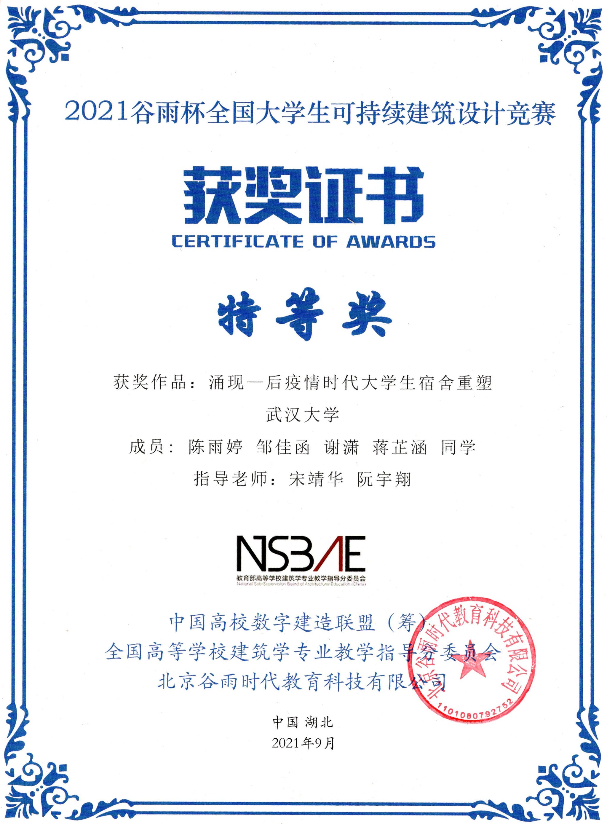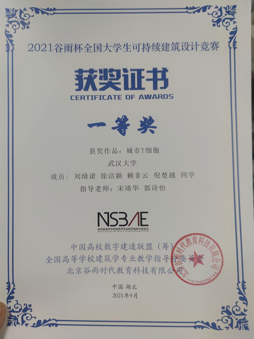 新闻网讯(通讯员徐洁颖) 9月25日,由全国高等学校建筑学专业教学指导分委员会建筑数字技术教学工作委员会支持,北京谷雨时代教育科技有限公司赞助、武汉大学城市设计学院承办的“第十五届谷雨杯全国大学生可持续建筑设计竞赛”落下帷幕。该竞赛是全国大学生数字建筑设计竞赛等级最高、规模最大的竞赛,评委来自全国建筑学专业教学指导分委员会数字工作委员会委员及数字建筑领域前沿的学者及专家。武汉大学城市设计学院建筑学专业本科生在此次竞赛中表现优异,10组队伍从全国1362支学生代表队中脱颖而出,斩获特等奖1项、一等奖1项、二等奖3项、三等奖3项、优秀奖2项。获奖团队及指导老师名单如下: