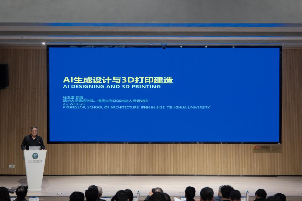 清华大学建筑学院徐卫国教授发表主题演讲:AI生成设计与3D打印建造。他深入解析了人工智能在建筑设计生成、结构优化与新型建造技术中的应用前景,展示了未来建筑生产方式的变革方向。他从人工智能与建造科技的融合出发,分享了AI驱动的设计逻辑与3D打印建筑的最新应用案例,展示了数智技术如何重塑建筑设计的创作模式与产业生态。