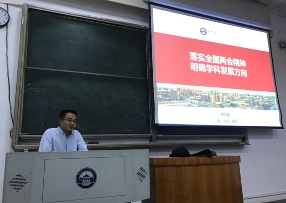 课上,李院长首先对2019年两会中《2018年政府工作报告》进行了基本回顾,对2018年以来的社会经济发展进行了梳理,并总结出一系列与城乡发展相关的内容条款,并以关键词的方式一一讲解了国家发展战略中涉及到我院学科发展和实践的问题,包括生态环境问题、区域协调发展问题、乡村振兴问题、新型城镇化问题、多规合一、“一带一路”等等,课程中既有国计民生的政策解读,也有对学科前沿的研究方向和方法关切。随后,李院长又对“政府工作报告”中2019年的展望,从专业的角度进行了归纳总结,并详细分析了宏观政策取向、宏观调控、优化营销环境、创新引领发展、脱贫攻坚、绿色发展、深化改革、对外开放以及政府职能转变等与学科发展的关系,明确指出作为党员的历史使命和责任担当,作为高校,我们不仅要把在综合性大学办城乡规划专业的优势体现出来,还要从专业实践出发,做人民满意的城乡规划和建筑设计。