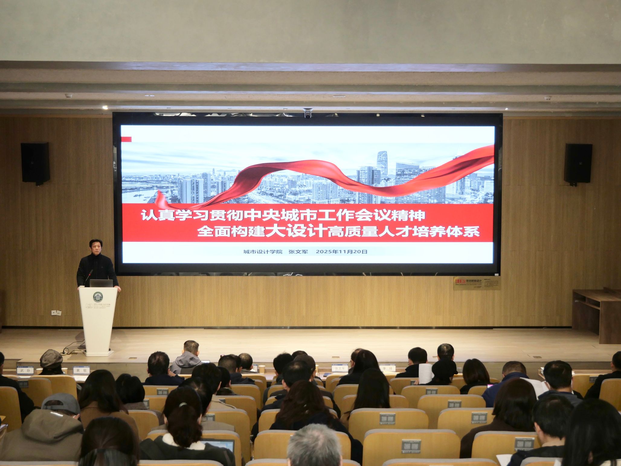 本网讯(通讯员李瑶、罗杰、唐泽楷)为深入学习贯彻习近平总书记关于“十五五”规划编制工作的重要指示精神,落实立德树人根本任务,11月20日,城市设计学院党委书记张文军以“认真学习贯彻中央城市工作会议精神、全面构建大设计高质量人才培养体系”为题,为全院师生党员讲授专题党课。李志刚院长主持报告会。