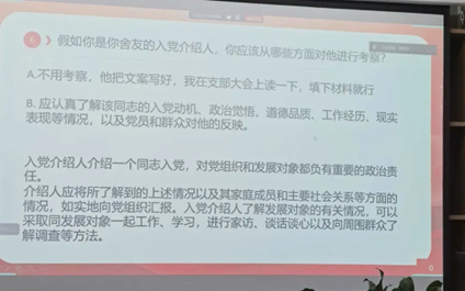 为深化学习成效、丰富学习形式,支部创新设置抽题作答的互动环节,题目聚焦党课核心内容、党的基本知识以及支部日常工作中的常见问题,同志们积极参与、踊跃作答。通过互动检验学习成果、巩固基础知识、重温入党誓词、厘清日常误区。