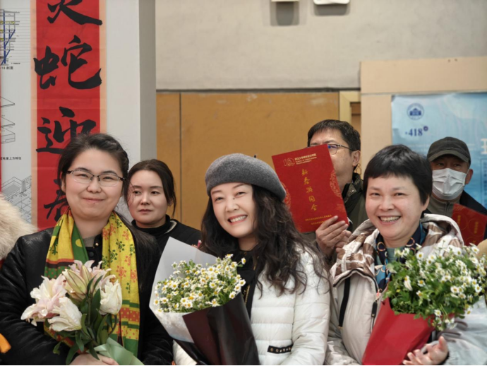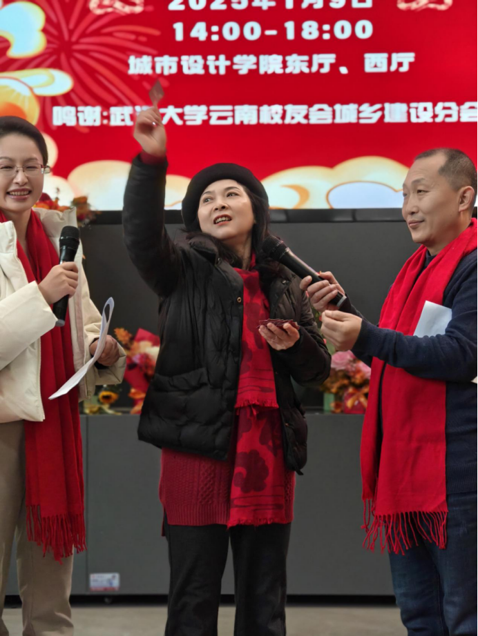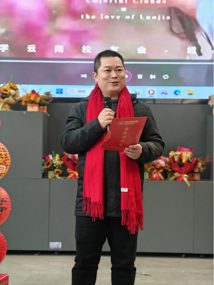 武汉大学云南校友会城乡建设分会每位教职工赠送一束鲜花,传达新年的问候。徐轩轩老师受分会委托宣读新年贺信,现场播放了校友们拍摄的祝福视频,让在场师生感受到了来自远方的关怀与祝福。