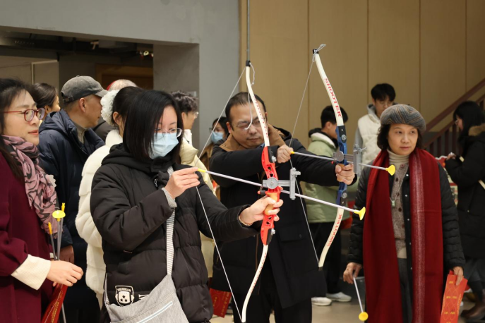 东厅的趣味游戏 6+1”模块,6 个传统游戏吸引了众多师生的目光。投壶摊位前,大家手持箭矢,瞄准靶心,体验精准与力度的较量;猜灯谜区域,谜语如繁星闪烁,参与者们在谜语的海洋里尽情遨游,展现智慧与趣味的火花;手脚并用游戏考验着四肢的默契,快乐蹴鞠让大家在足球的旋转中寻找射门的快感;乐享捶丸则融合了技巧与趣味,精准射箭挑战着专注与精准的极限。这些传统游戏不仅让大家在欢笑中感受到了古人的智慧与乐趣,更增进了师生之间的交流与互动。