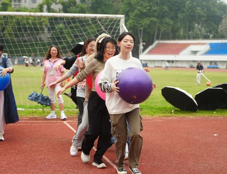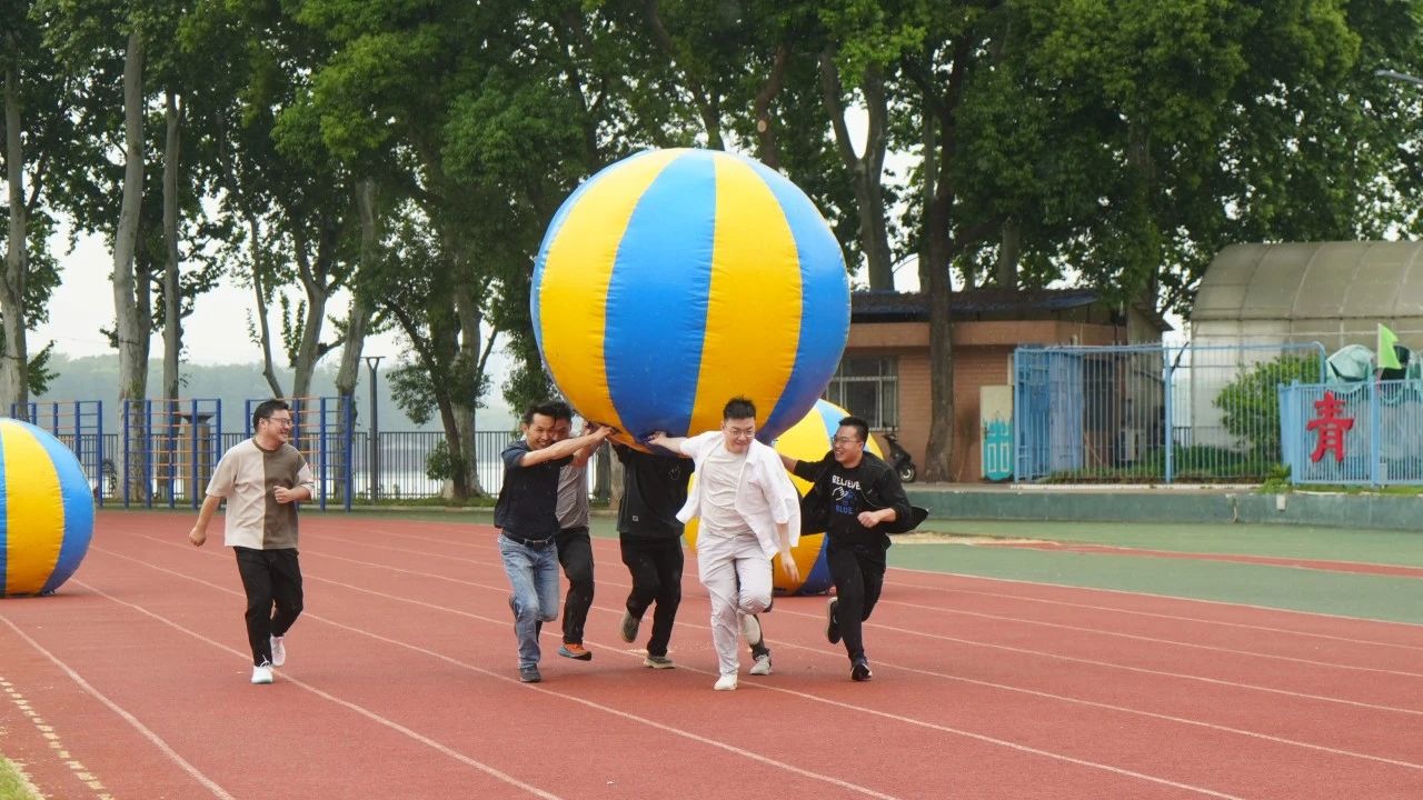 随着裁判员的一声令下,六人共同托举起巨型充气球体,碎步奔行间竭力维持平衡。“快快快”,督促声代替加油声,成为胜利的助推器。