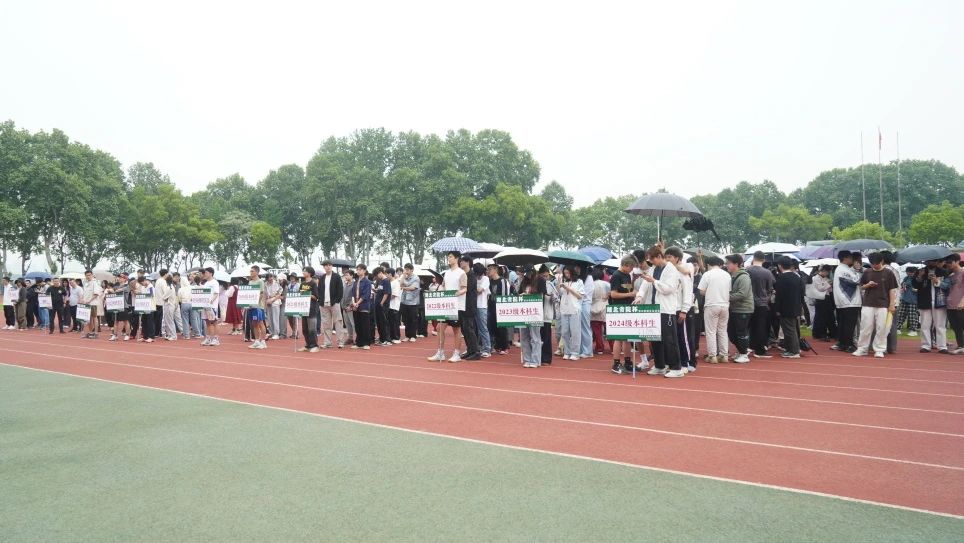 4月24日下午13点30分,老师同学们不畏细雨绵绵,准时到达工学部田径场,井然有序地等待院运会的开幕。