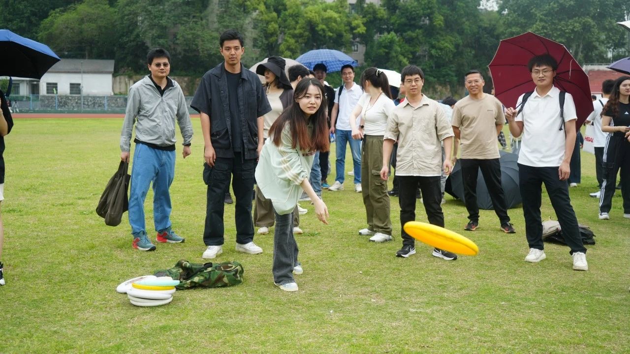 六人接力掷出弧线,飞盘轻盈落向九宫格网架,积分随着欢呼节节攀升,每位队员都全力以赴,为了团队的荣誉奋勇争先。