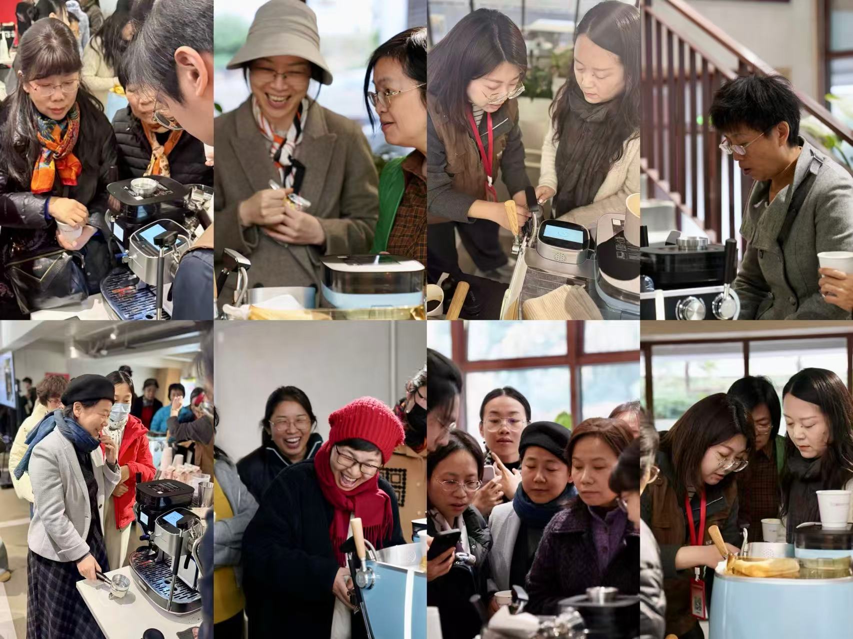 培训现场布置雅致,一致排开的操作台上整齐陈列着咖啡机、拉花缸与新鲜咖啡豆,暖黄灯光与绿植相映,空气中弥漫着咖啡焦香。专业咖啡师从咖啡豆产地、烘焙工艺,到意式浓缩萃取、奶泡温度控制,带来深入浅出的理论分享。“原来冲咖啡有这么多学问!” 老师们一边认真聆听,一边轻声交流。