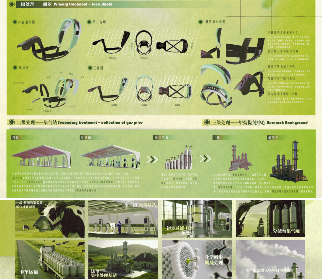 “智汇牧能”以全球温室气体减排与可持续牧业发展为核心议题,针对反刍动物养殖业中的甲烷排放问题,提出了“牧场甲烷捕获收集”系统设计方案。项目旨在从“排放源”入手,通过科技手段将甲烷排放转化为可再利用能源,实现牧业生产与生态环境的双重平衡。系统由三个层级构成:一级处理——捕获,设计了贴合牛只面部结构的可穿戴甲烷收集装置,可在动物反刍期间不影响进食与呼吸实现嗳气实时捕获;二级处理——气体收集,通过牧场覆盖结构将收集到的甲烷统一输送至储存与净化装置,完成气体分类与暂存;三级处理——甲烷精制中心,利用生物过滤与化学吸附技术,将甲烷转化为燃料气体,并入本地管网,用于发电、炊事与供暖,直接惠及牧场与周边农村社区。同时也设计了配套的智能管理平台,可实时监测牧场温湿度、气体浓度及设备运行状态,为牧业能源化提供数字化支持。“智汇牧能”将产品、信息与环境系统融合,为农业增收、乡村振兴提供了一条环保与经济效益双赢的可持续发展路径,为中国农业绿色转型赋能。
