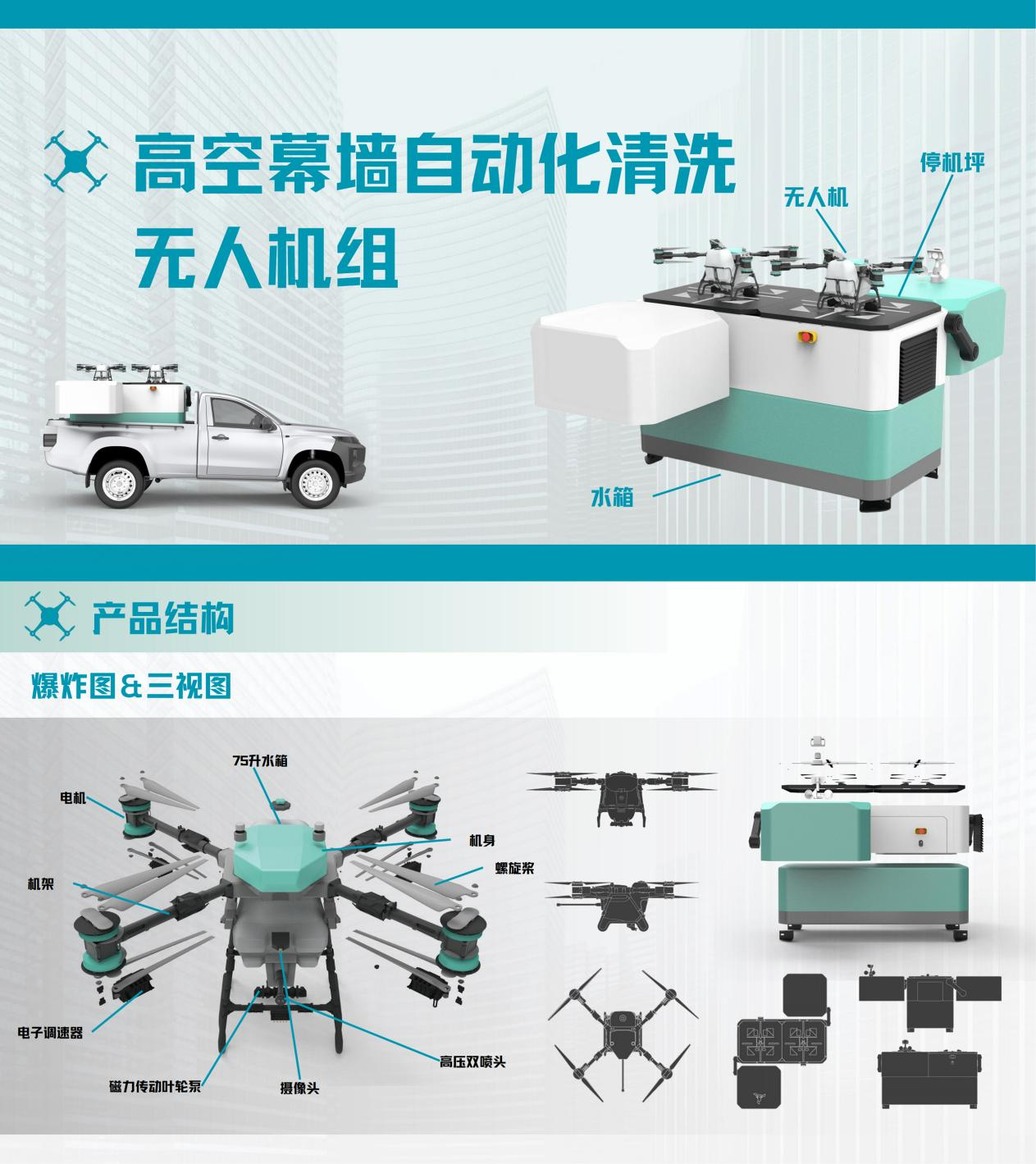 作品名称:高空幕墙自动化清洗无人机组