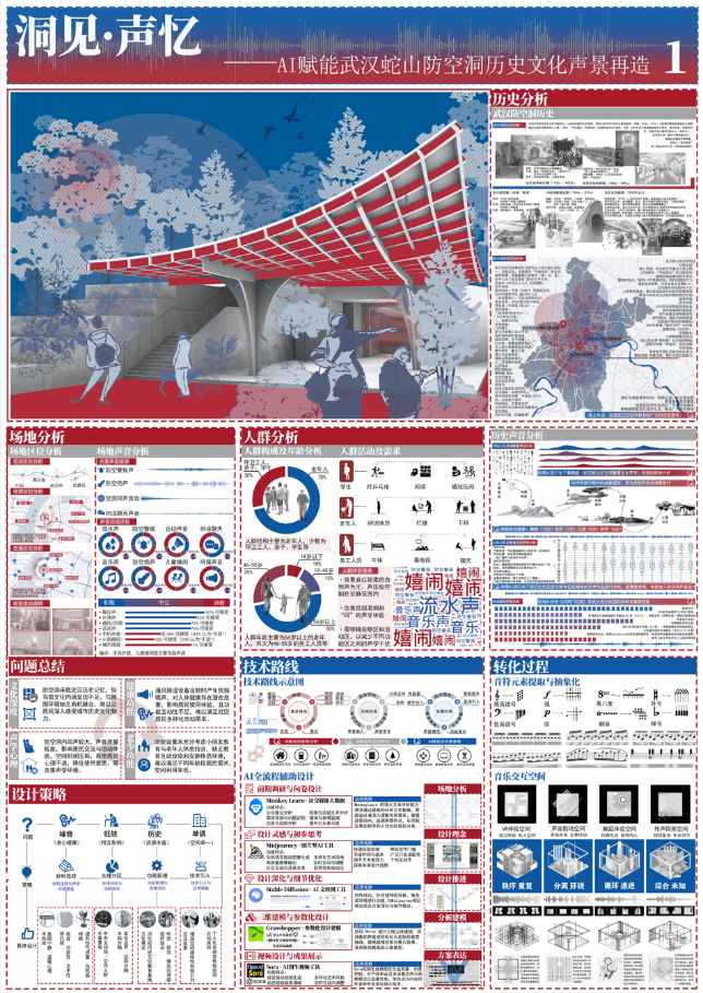 作品以武汉蛇山防空洞为设计对象,创新性地运用AI技术重塑历史文化声景体验。设计从历史和现实双重维度出发,通过AI分析黄鹤楼相关诗词歌赋的韵律特征,提取红色歌曲与武汉民谣的声学元素,构建具有文化认同感的声景系统。