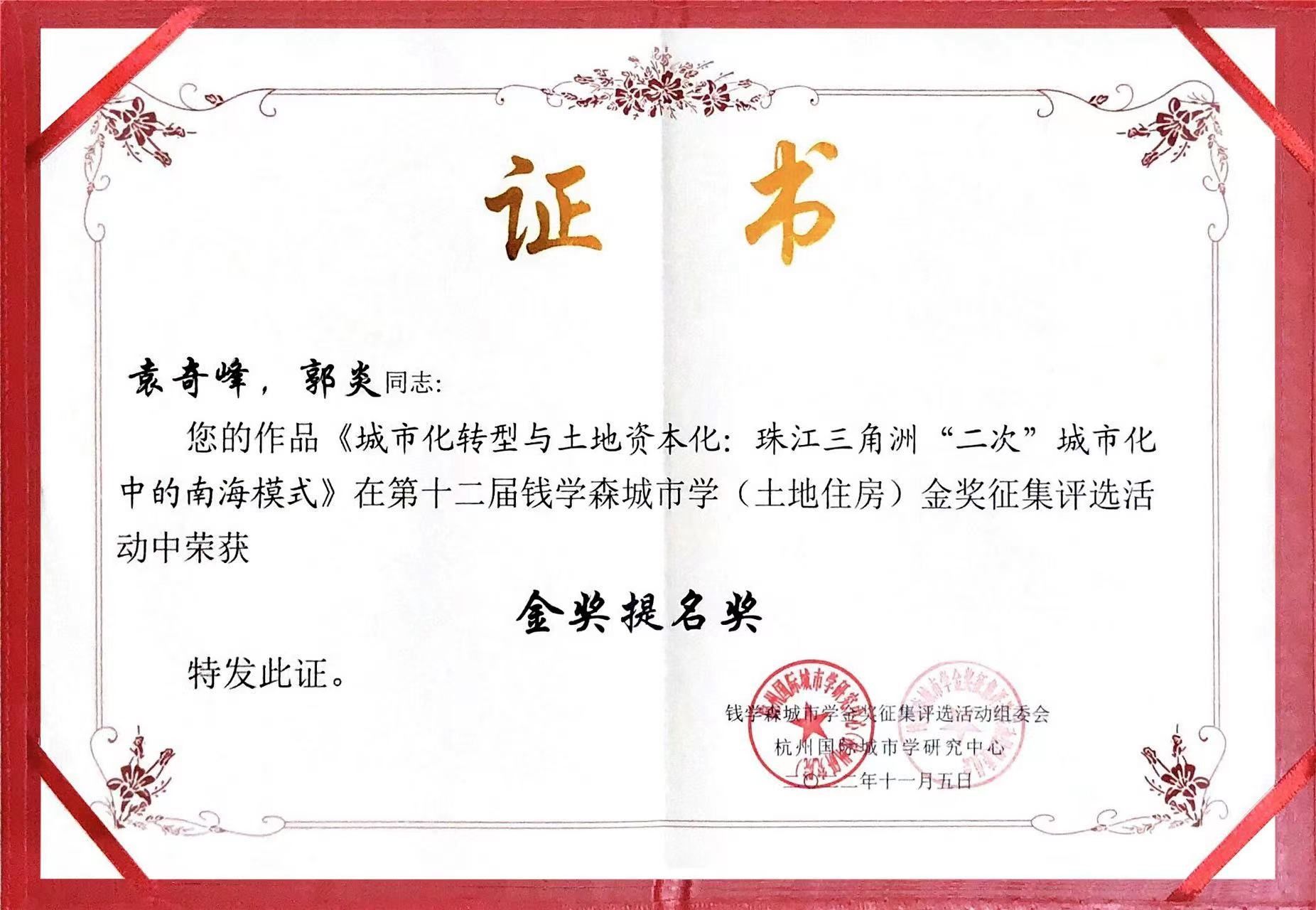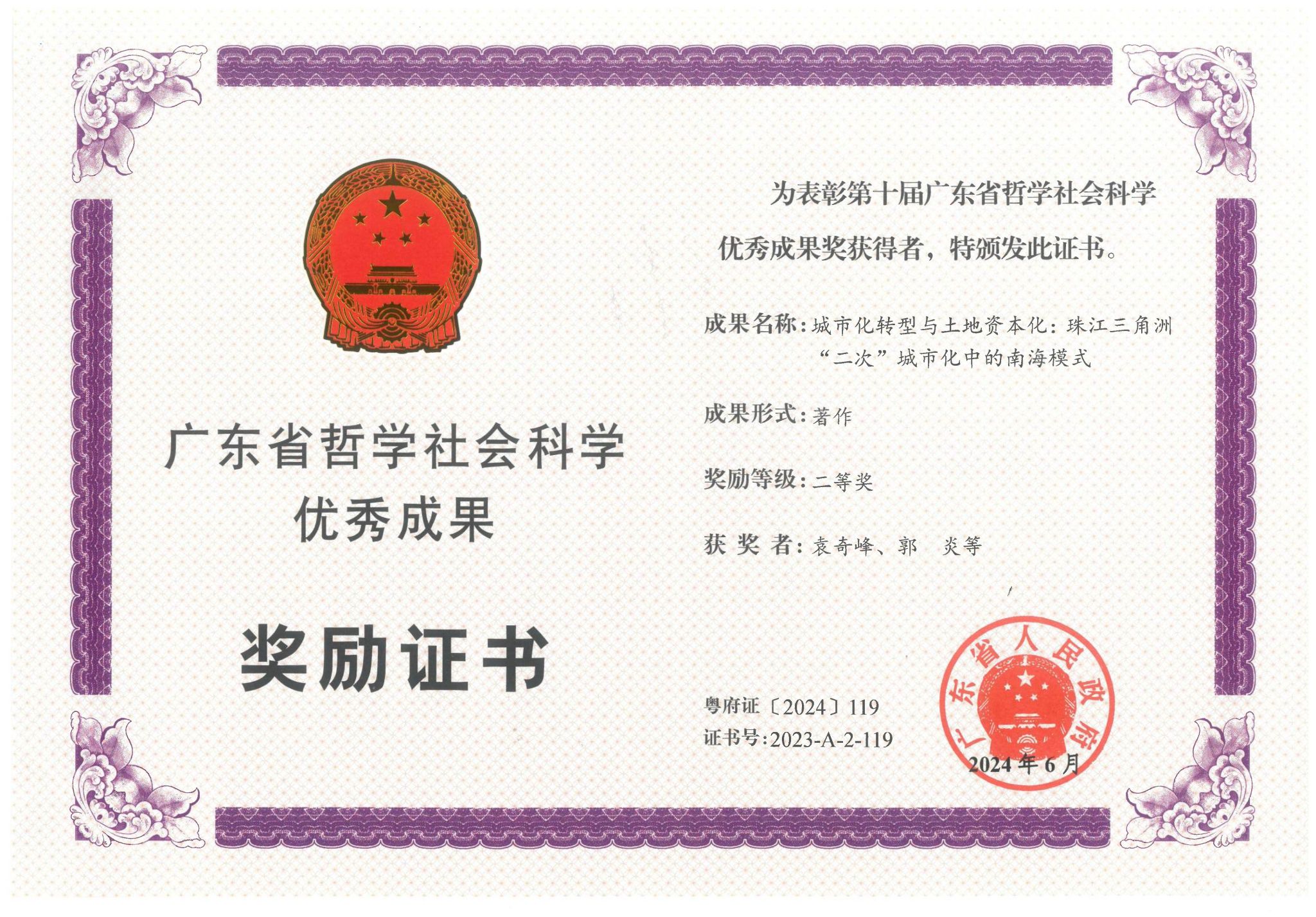 6月28日,第十届广东省哲学社会科学优秀成果奖颁奖大会在广州举行,我院郭炎教授与华南理工大学建筑学院袁奇峰教授合著作品《城市化转型与土地资本化:珠江三角洲“二次”城市化中的南海模式》获得专著类二等奖。