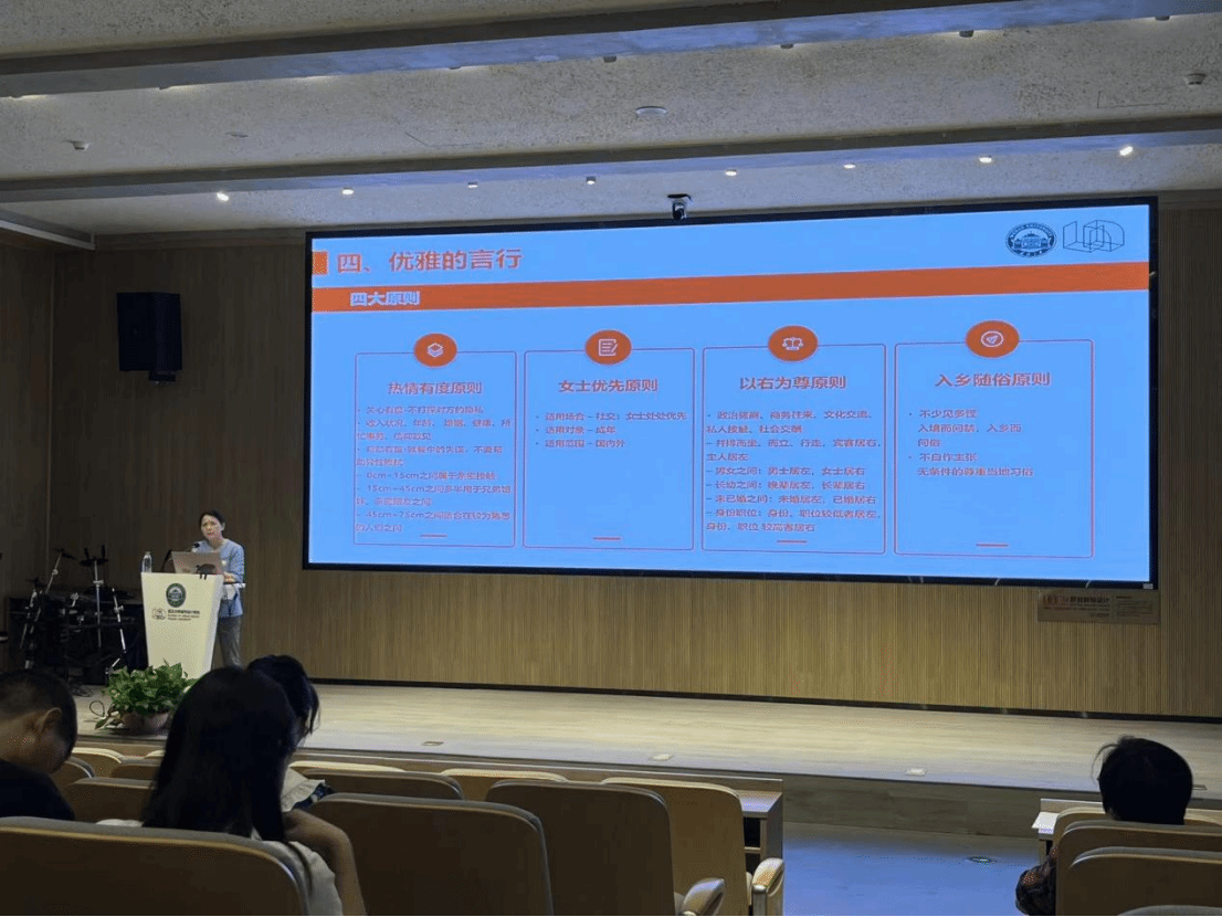 礼仪文化是中华传统文化的重要载体,中华传统文化为仪礼文化提供了丰富的内涵和深厚的底蕴。李琦副书记以礼仪教育为主题,向毕业生讲解了基本的礼仪知识,旨在提升加强大家讲礼、守礼、明礼等基本礼仪意识和观念,主要从五个方面对我院毕业研究生做出了重要提醒:一是要注重得体的着装,工作中要注重个人仪表、仪态管理、服饰搭配、保持服装整洁、干净卫生等方面,重视给人的第一印象,李琦副书记向学院毕业研究生讲解了得体的仪容仪表的三个关键要素,分别为三色原则、三一定律、三大禁忌,提醒研究生同志注重不同的场合和得体的个人形象;二是要保持和悦的微笑,微笑是最有效的沟通方式,在不同的场合不同的情况,要注重控制自己的情绪,时时刻刻保持微笑,给人良好的印象,带给别人好的感受和氛围,微笑同时也是一种职业素养,一种传递友好的方式,人际交往当中的润滑剂,需要时刻保持;三是要有谦逊的姿态,注重举手投足、言谈举止,需保持端正的姿势,从中展现出自己的素质修养和文化内涵;四是要保持优雅的言行,讲究热情有度、女士优先、以右为尊、入乡随俗的原则,行为举止注重分寸,注重个人姿态和细节。此外,李琦副书记还就握手礼仪、名片礼仪、接待礼仪、电话通讯用语等方面进行了强调,无论何种,都需在尊重他人的前提下进行,并且需要注意分寸;五是要具有妥善的安排,各种场合的座次安排,会议接待等方面都需要注意细节,在应有的礼仪指导下进行细节的安排,包括会前提前准备、会中妥善安排、会后及时总结记录,注重工作从开始到完成的全流程闭环。