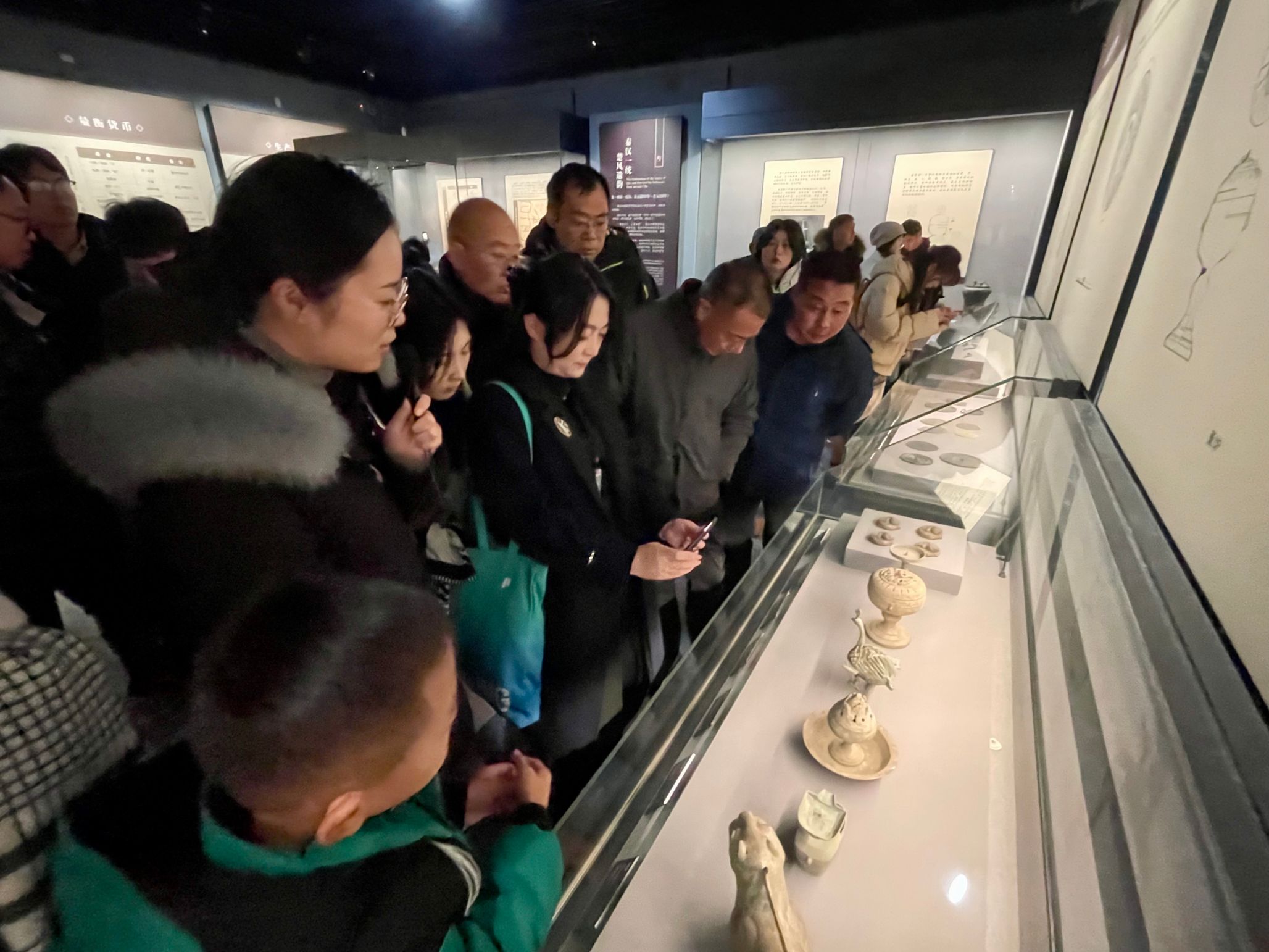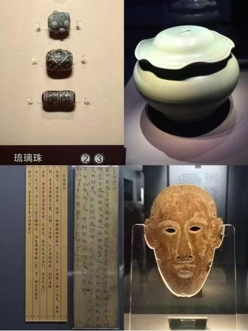 接着,师生们在二楼依次游览了“楚玉撷英——荆州出土玉器展”“书于竹木——荆州出土简牍展”“陶苑奇珍——荆州出土古代瓷器展”。随着一件件文物瑰宝和考古成就展现在眼前,师生们认真聆听着讲解员生动全面的介绍并不时提问,既领略到秦式、中山式、越式、东夷式等不同形制玉器的精美,又得以解读两千年前简牍承载的文化密码,还窥探到古代地区经济繁荣背景下瓷器文化的发展脉络。众多珍品中,精美的玉覆面及其“五官偏斜”之谜、记述翔实的简牍及古代狱讼之公和“十大最美馆藏文物”之一的青釉荷叶形盖罐令人印象深刻,激发了师生强烈的文化自信和保护传承发展好文化遗产的历史责任感。