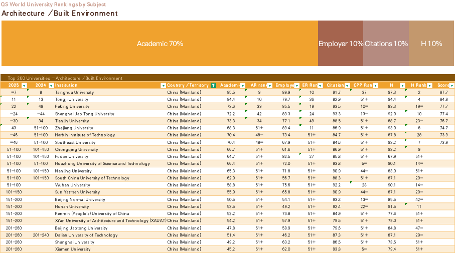 2021年武汉大学建筑学科首次进入QS排名,位列201-250区间。经过不懈努力,2025年,武汉大学建筑学科凭借其深厚的历史底蕴、优秀的师资队伍以及在教学科研、国际影响力方面的能力提升,逐渐在国际舞台上崭露头角,一举进入全球51-100强。