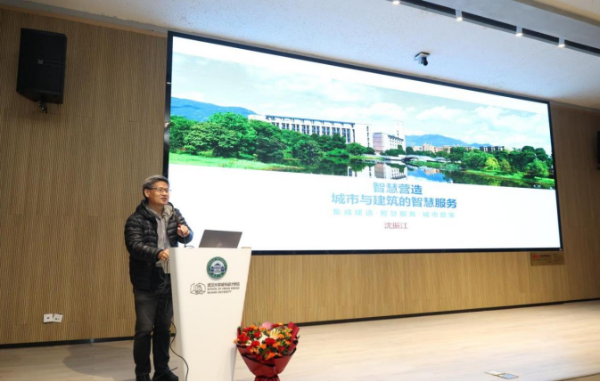 武汉大学城市设计学院2025年《大师哲思》课程第五讲于10月24日晚上在学院专教楼报告厅顺利举行。本次课程邀请到日本工程院外籍院士、福建省特级人才、教育部国家级人才、福州大学建筑学院沈振江教授主讲,武汉大学城市设计学院党委书记张文军、副院长黄经南教授以及多位教师代表受邀出席。张文军向沈振江颁发大师哲思纪念牌,黄经南主持讲座。
