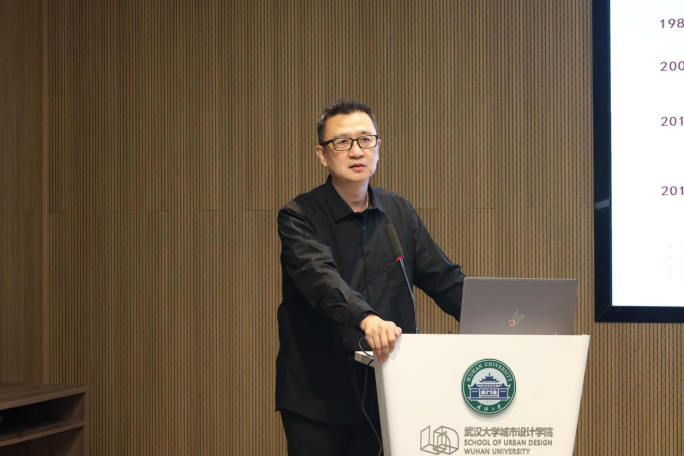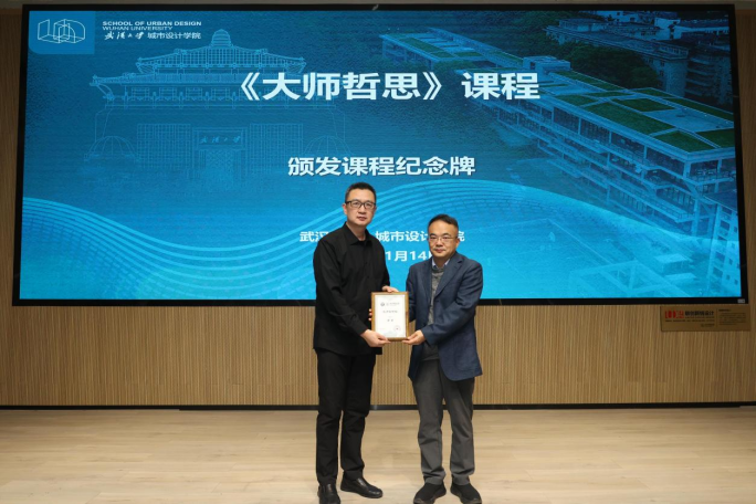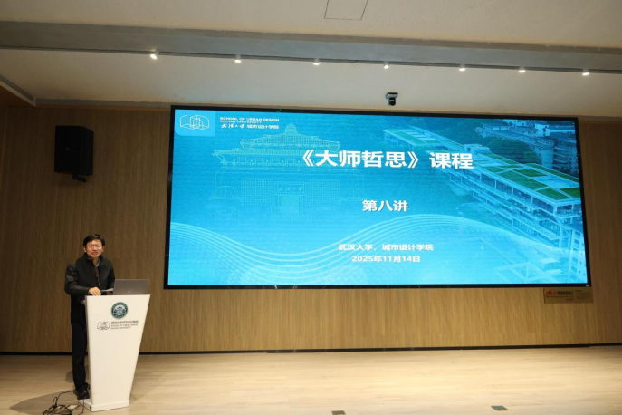 武汉大学城市设计学院《大师哲思》课程第八讲于2025年11月14日晚间在专教楼报告厅正式举行。本次讲座邀请到中国建设科技集团副总建筑师、中国建筑设计研究院副总经理、副总工程师、住建部农房工程技术创新中心主任景泉主讲。武汉大学城市设计学院院长李志刚教授,建筑系主任刘炜教授以及多位教师代表受邀出席。李志刚向景泉颁发大师哲思纪念牌,刘炜主持讲座。