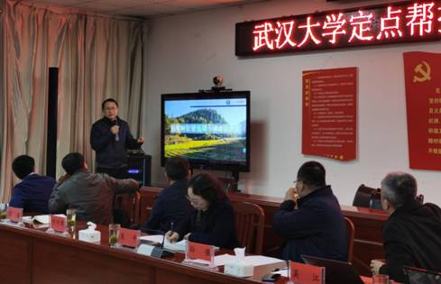 随后,在16日上午,武汉大学副校长吴平一行抵达白果树村,在白果树村委会召开了武汉大学定点帮扶恩施市工作座谈会。会上,团队负责人牛强教授向武汉大学领导和当地政府汇报了白果树村开展“智慧低碳小镇”的规划策略,意在通过“智慧低碳、多能互补”的理念进行项目规划,引入学校相关教育教学、科研实践、校友活动等资源,活化乡村经济,进一步巩固脱贫成果,实现乡村振兴,从而集中发挥武汉大学在帮扶上的重大作用。