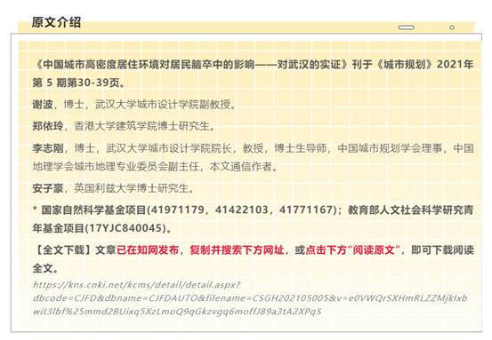 该文提出了城市建成环境与公共健康研究的框架,基于2015年武汉市居民“脑卒中”疾病数据,识别脑卒中风险高发区,运用空间回归分析方法,研究中国城市高密度居住环境对居民脑卒中的影响和作用机制,并探讨高密度居住环境背景下主动干预居民脑卒中风险的规划策略。