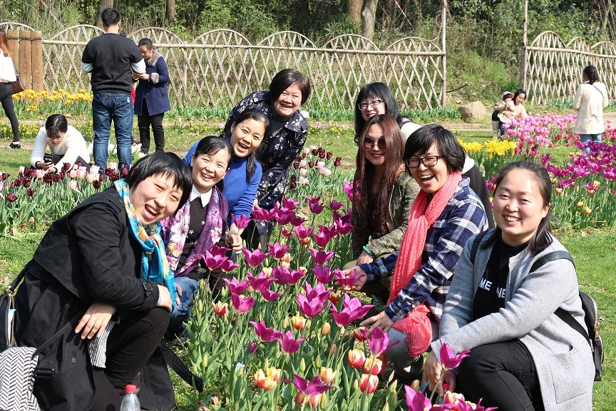 暖春时节,阳光灿烂,郁金香正浓,兰花正艳。集体午餐后,大家进入植物园赏花。郁金香品种繁多,参差错落,或红、或白、或粉、或紫,群芳斗艳,在花海中穿行,朵朵沁人心脾。大家纷纷与花合影留念、与身边的美人合影留念。正是“春风吹面薄于纱,春人妆束淡于画。游春人在画中行,万花飞舞春人下。”赏花后,大家沿东湖绿道游春返回学校。