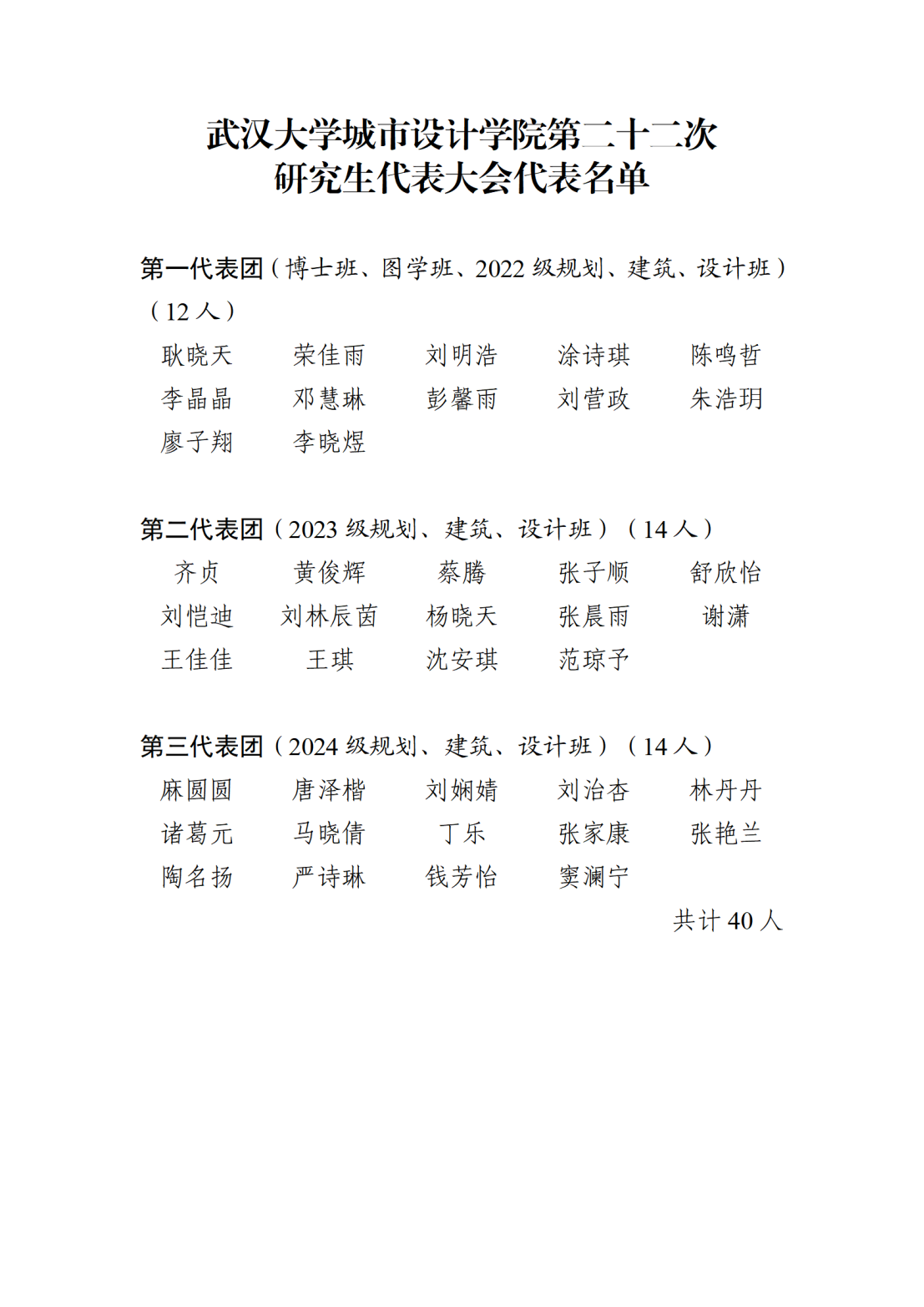 根据《关于推选武汉大学城市设计学院第二十二次研究生代表大会代表的通知》的有关规定,经个人意愿报名、班级/团支部差额选举、资格审查通过后,我院产生第二十二次研究生代表大会代表名单如下: