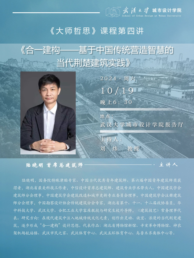武汉大学城市设计学院以武汉大学人才培养年为发展契机,以提升人才培养质量为育人基础,精心打造《大师哲思》课程,本课程围绕国家战略需求,从大师视角为研究生解读城乡规划、建筑、景观、设计各学科的前沿理论与实践。本课程于每周六晚18:30在城市设计学院负一楼报告厅进行。课程将邀请10位院士、大师面向全院研究生授课,以研究生的启发教育为切入点,探讨城乡规划、建筑、景观、设计领域的前沿理论与实践创新,更好地激发研究生的创新意识与创新思维,提升研究生的专业素质和实践应用能力,开拓思维,启迪思考,为研究生的学术发展奠定良好的基础。