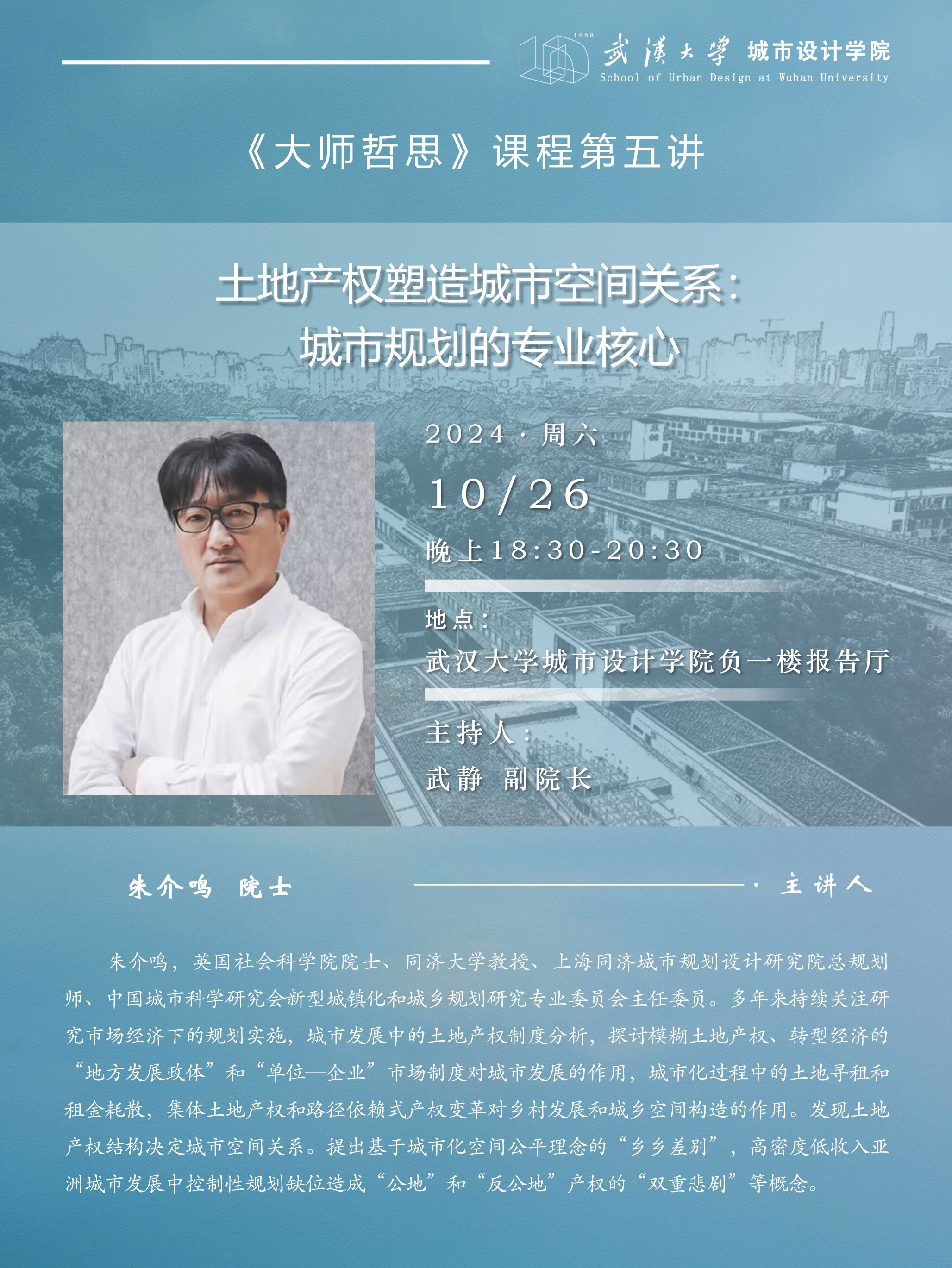 武汉大学城市设计学院以武汉大学人才培养年为发展契机,以提升人才培养质量为育人基础,精心打造《大师哲思》课程,本课程围绕国家战略需求,从大师视角为研究生解读城乡规划、建筑、景观、设计各学科的前沿理论与实践。本课程于每周六晚18:30在城市设计学院负一楼报告厅进行。课程将邀请10位院士、大师面向全院研究生授课,以研究生的启发教育为切入点,探讨城乡规划、建筑、景观、设计领域的前沿理论与实践创新,更好地激发研究生的创新意识与创新思维,提升研究生的专业素质和实践应用能力,开拓思维,启迪思考,为研究生的学术发展奠定良好的基础。