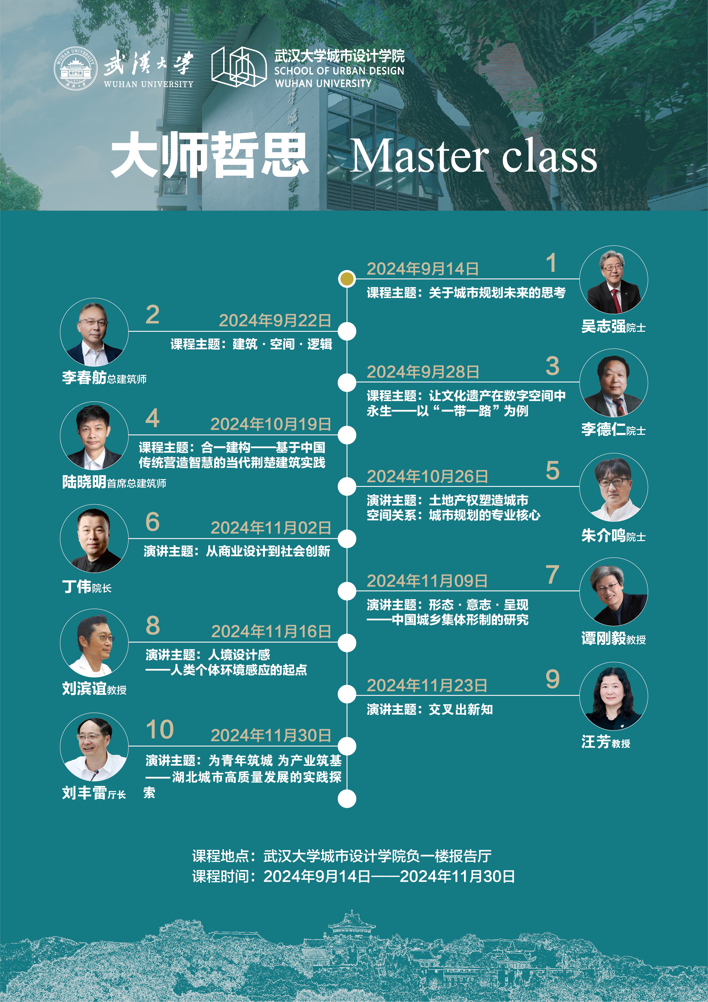 武汉大学城市设计学院以武汉大学人才培养年为发展契机,以提升人才培养质量为育人基础,精心打造《大师哲思》课程,本课程围绕国家战略需求,从大师视角为研究生解读城乡规划、建筑、景观、设计各学科的前沿理论与实践。本课程于每周六晚18:30在城市设计学院负一楼报告厅进行。课程将邀请10位院士、大师面向全院研究生授课,以研究生的启发教育为切入点,探讨城乡规划、建筑、景观、设计领域的前沿理论与实践创新,更好地激发研究生的创新意识与创新思维,提升研究生的专业素质和实践应用能力,开拓思维,启迪思考,为研究生的学术发展奠定良好的基础。