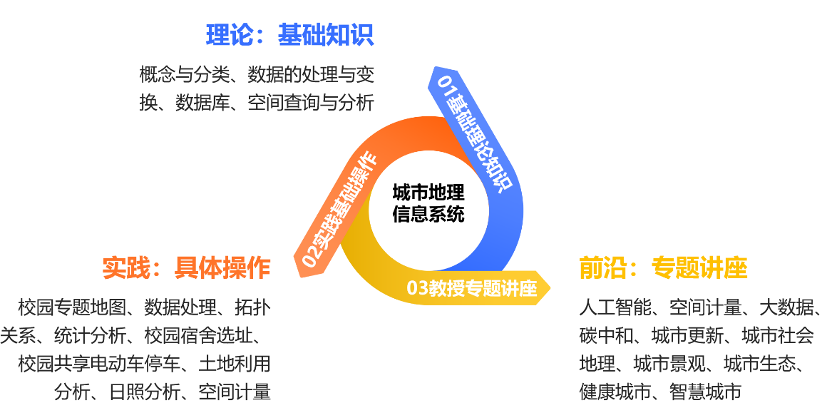 因此,在课程组的精心组织下,《城市地理信息系统》课程形成了“理论”+“实践”+“前沿”交互、融合的教学方式(如图)。通过上理论课,我们培养学生的专业知识和思维能力的培养,让他们充分了解人工智能背景下城乡建设、规划专业的前景与应用;通过实践操作,我们侧重于“手把手”的过程式传授,使学生具备扎实的GIS操作能力;通过前沿专题讲座,培养学生们的专业热情并奠定坚实的学术基础,为日后的学习和职业生涯奠定坚实的专业素养基础。