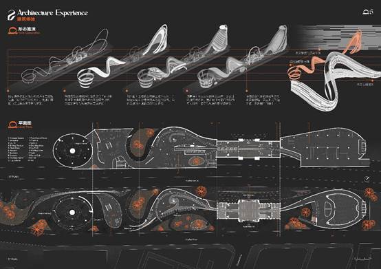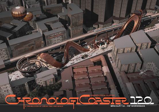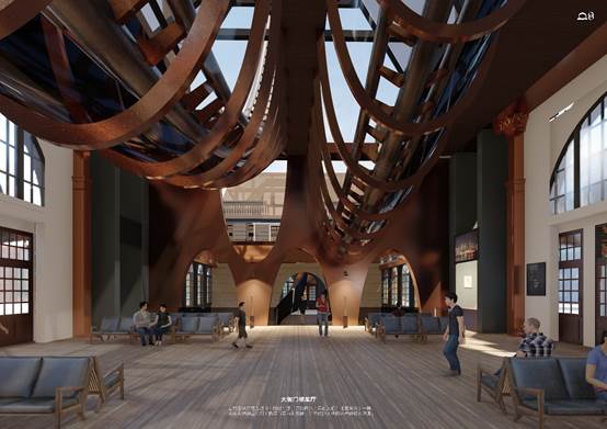 第二件是吴楚风、路畅同学的作品《编年史过山车:大智门线性时空转译实验》。该方案希望在理想情况下给老建筑赋予最新鲜的活力。设计中大胆地将过山车植入到了大智门老火车站中,在呼应铁轨元素的同时,用线性空间的多元体感体验转译往日发生在大智门的历史烟云。