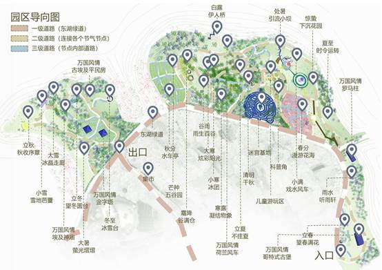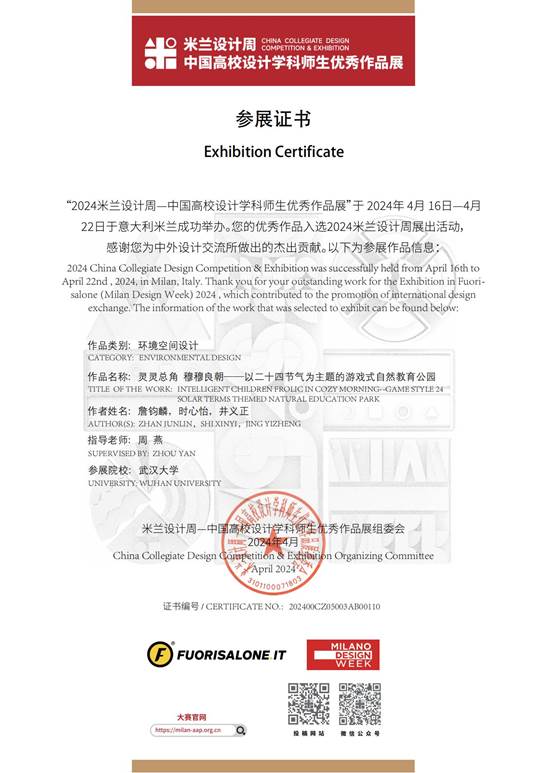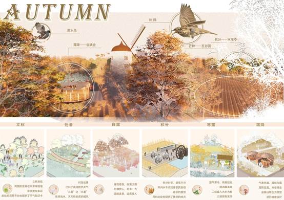 第一件是由詹钧麟、时心怡、井义正同学共同完成的作品《灵灵总角 穆穆良朝——以二十四节气为主题的游戏式自然教育公园》。该方案从城市儿童的“自然缺失症”出发,结合中国传统二十四节气文化,打造游戏式的自然教育公园。整体公园设计成闯关的游戏模式,希望能够吸引儿童走向室外,接触自然,同时增加亲子之间的互动。