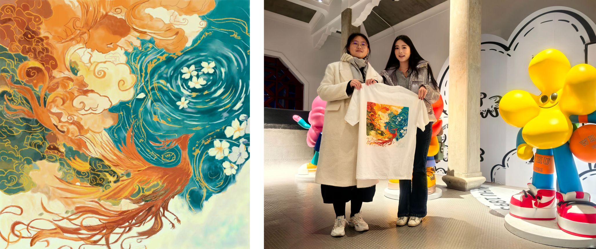 《凤鸣珞珈》采用对角线构图,展现了一只展翅高飞、羽翼橙红、尾部如火焰般的凤凰,象征着武大的生命力量与不屈精神。右侧湖水与云彩交融,云纹暖色调如宇宙能量,水纹冷色调似时空漩涡,点缀的白花象征未知与希望。通过橙红与蓝绿的对比,以及云纹和水纹的呼应,更传递了一种积极向上、勇于探索的精神面貌。