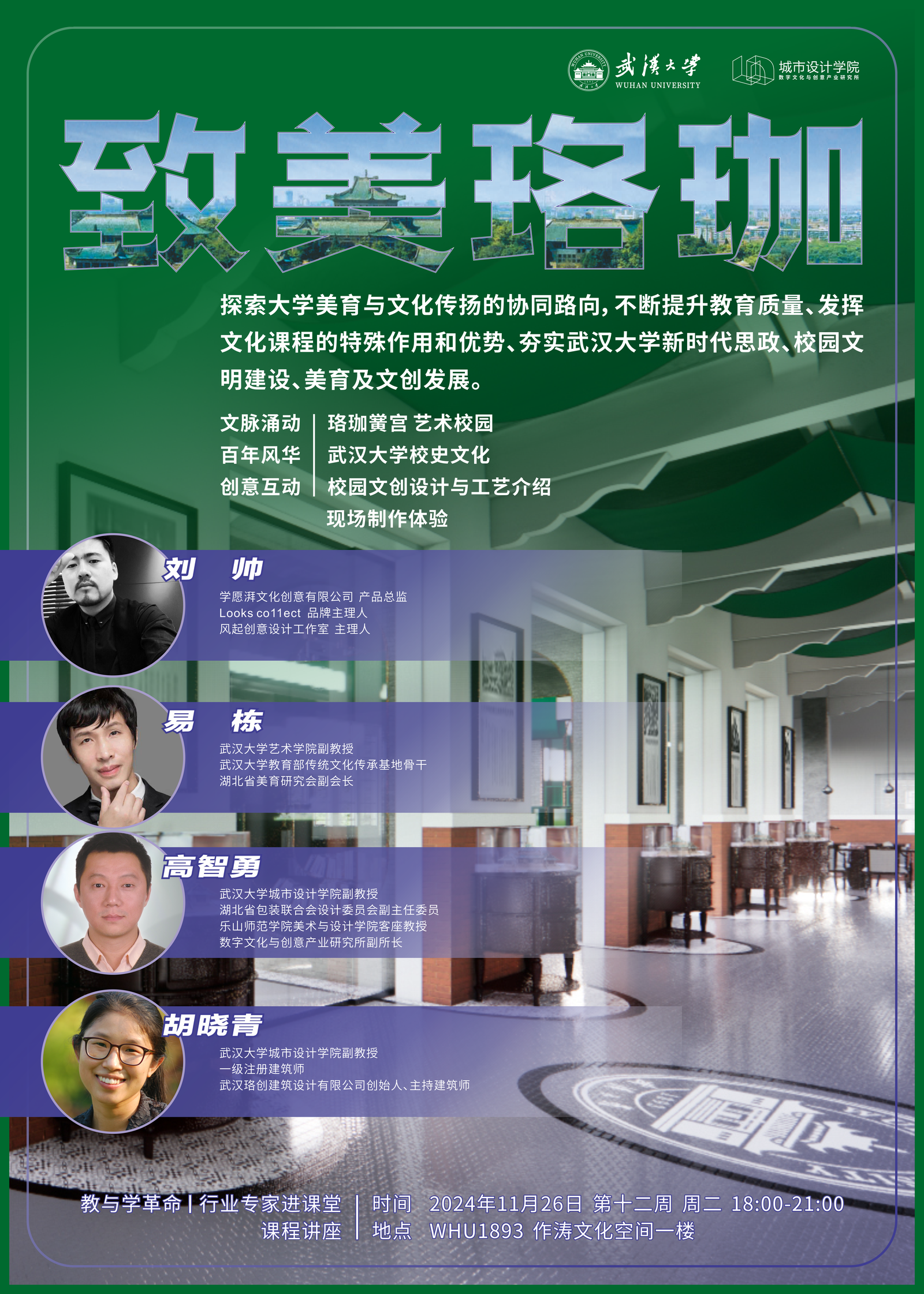 (通讯员:高智勇 易栋 刘帅 胡晓青)2024年11月26日,武汉大学城市设计学院数字文化与创意产业研究所高智勇副教授,数字建筑研究所胡晓青副教授、艺术学院易栋副教授、学愿湃文化创意有限公司刘帅首席设计官,为响应武汉大学在推动教育教学改革,提升教育质量和教学效率的“教与学革命”举措,探索大学美育与文化传扬的协同路向,不断提升教育质量、夯实新时代武汉大学课程思政、校园文明建设、公共美育及文化创意发展,在力求发挥设计学、艺术学学科特殊作用和优势的基础上,共同策划组织了“创意涌动 致美珞珈——武汉大学校园文化(文明)建设课程实践”。