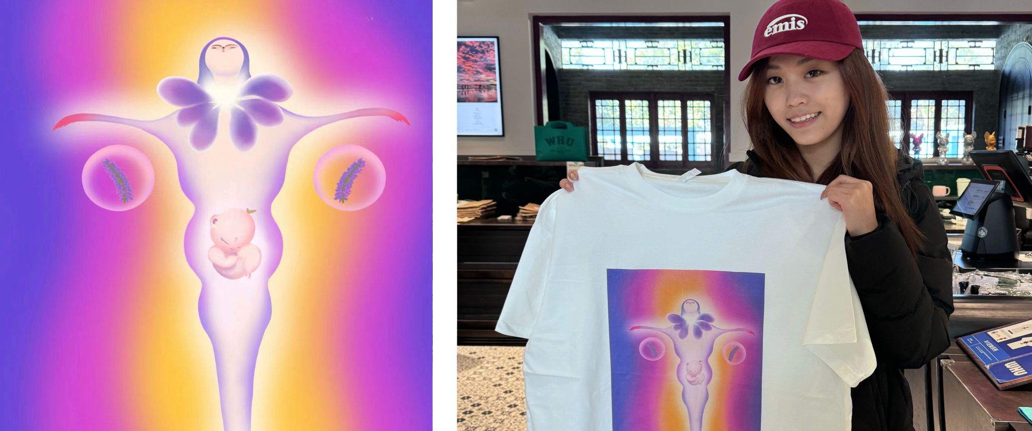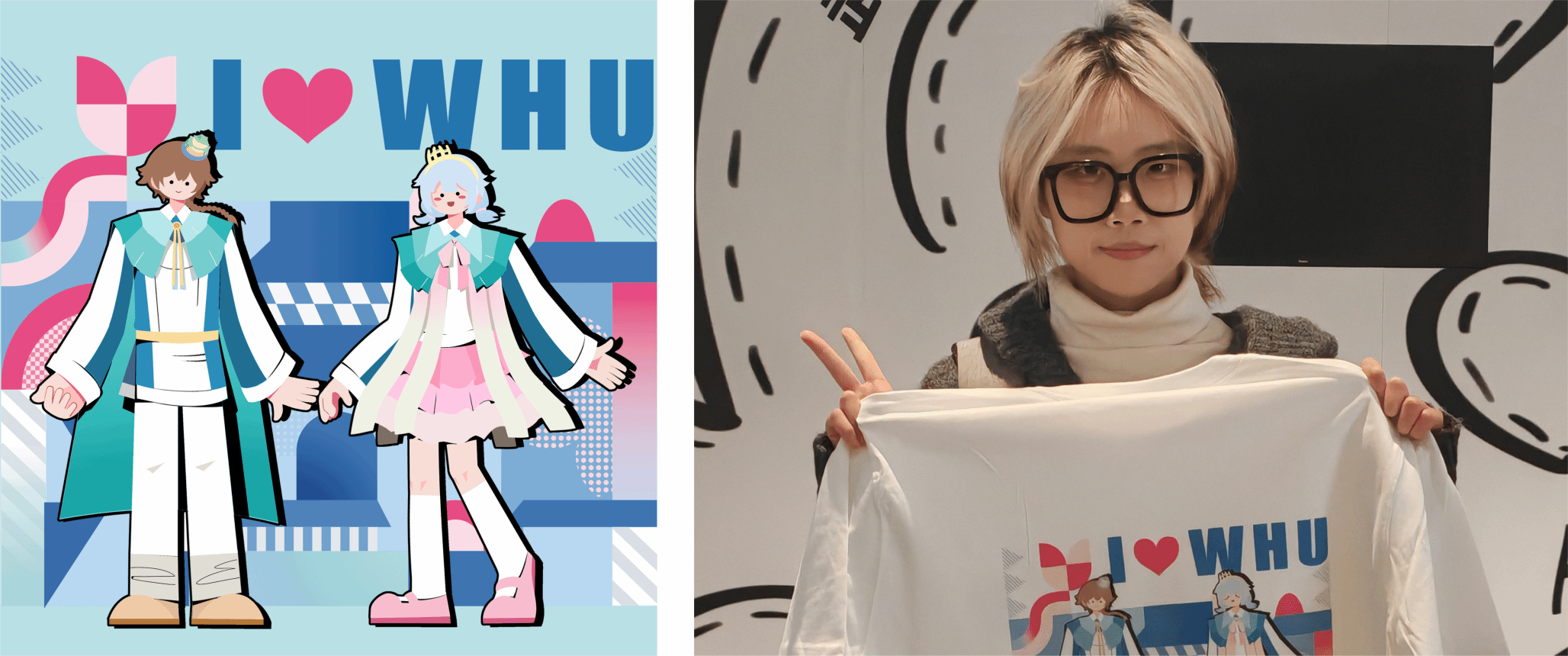 《珞珈缘记》作品的主体是武大的官方形象——珞珞、珈珈。尝试用扁平风格的插画形式来呈现,年轻的同学们手拉手,共同向人们发起邀约,展现了武大开放包容的姿态。背景以老图书馆、樱花、小狐狸等武大代表性元素为原型,通过平面解构与重组,构成一幅充满活力与趣味性的图景。右上角“I❤️WHU”的字样更是直观地表达了武大学子对母校的喜爱。