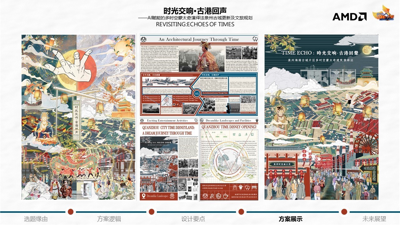 “时光交响・古港回声”是一项专注于泉州古城的现代化更新与文化旅游规划的作品。团队深入探索泉州海港古城片区,一个历史文化资源丰富却面临保护与发展挑战的区域。通过运用人工智能软件,如Midjourney和StableDiffusion,精准识别并应对了本土特色流失、文化传承断裂等问题,提出了以“时光迪斯尼”为核心的设计理念,旨在通过构建信俗、博览、文创网络空间,实现古城文化遗产的数字化传承。项目中,人工智能软件发挥了关键作用,它们被用来优化城市功能布局,同时保留历史建筑的原有风貌,为古城注入新活力。结合地理信息系统(GIS)数据,项目不仅展示了古城的空间塑造,还规划了其未来发展的宏伟蓝图,期望泉州古城能够成为历史文化与现代科技融合的典范,让每一位游客都能体验到传统文化与现代创新的交融。