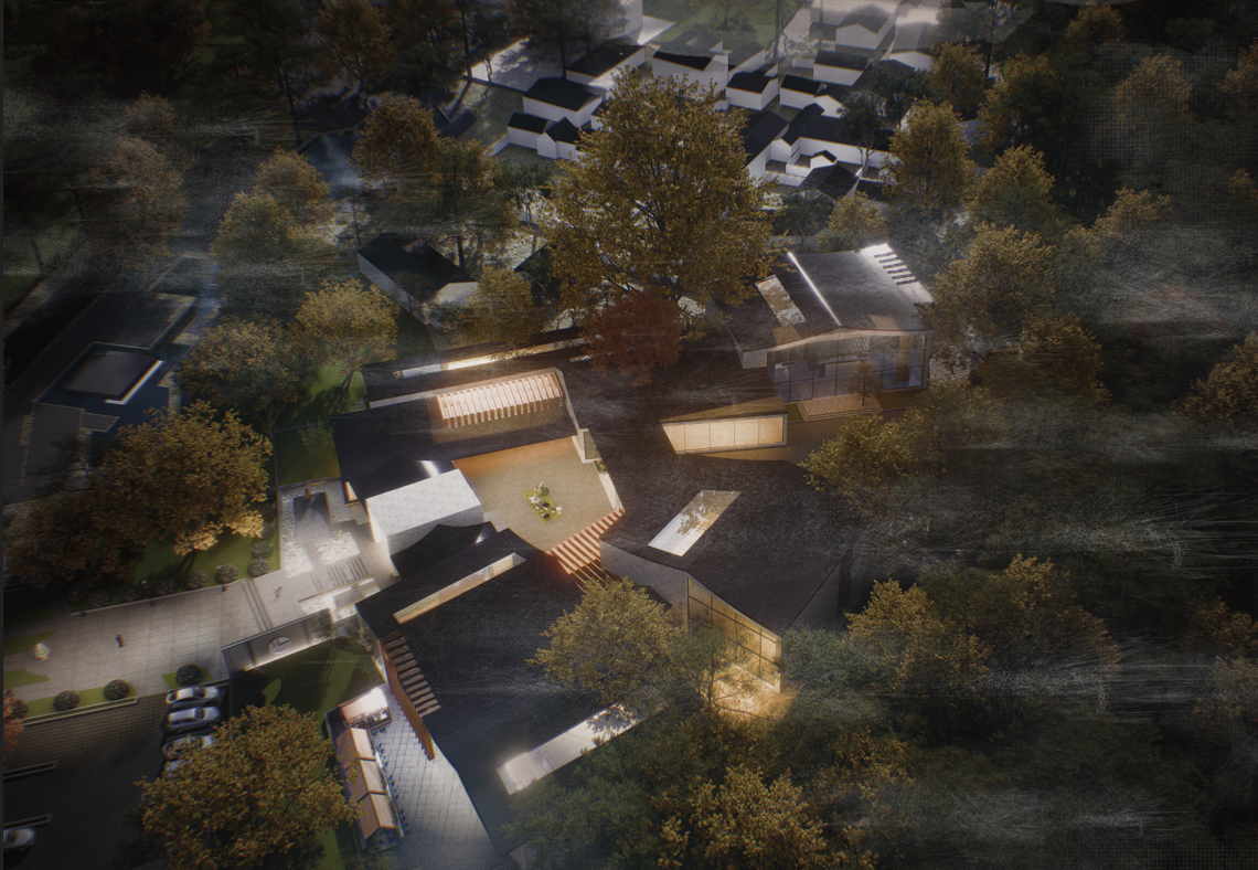 设计坐落于安徽省潜山市黄岭村,自然风光优美,文化底蕴深厚;该地为我国章回体小说大家张恨水先生的故居。基于对张恨水先生作品的探讨与对村落肌理的深度挖掘,我们选择了太湖石这一意象表达村落被自然打磨的天然感与恨水文化经久不变的永恒特性,展现不见水而知水的“恨水”氛围。