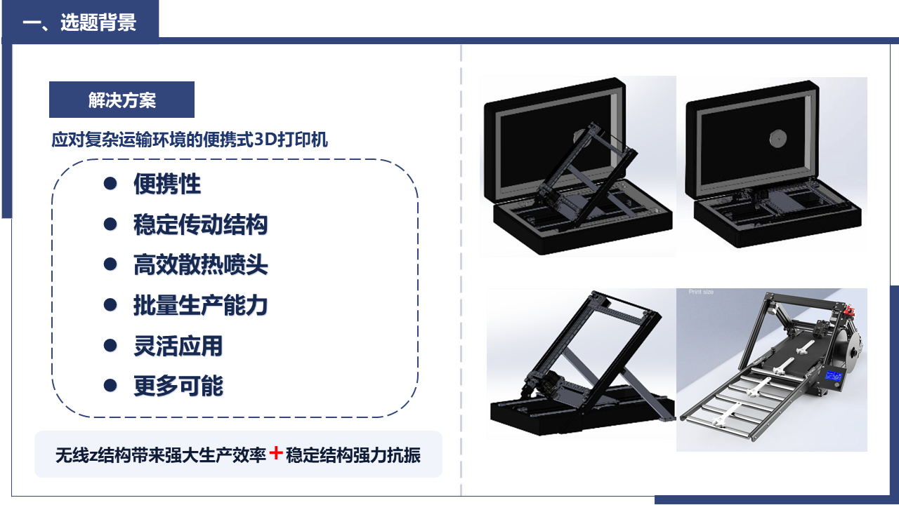随着科技的迅猛发展,3D打印技术在制造业、医疗、教育等多个领域得到了广泛应用。3D打印机的便携性和现场制造能力使其在应急救援、军事部署、远程科研探险等复杂运输环境中显得尤为重要。然而,这些环境对设备的体积、重量、耐用性、稳定性和操作简便性提出了更高的要求。我们设计了一款便携式3D打印机,具备以下特性:耐用性强,具有抗震、防尘、防水等特性,能够在恶劣环境下正常工作; 模块化设计,易于拆卸和组装,便于在现场快速部署和维护;高可靠性,在多次运输和长时间运行中保持稳定性和精度;操作简便:界面友好,易于操作。