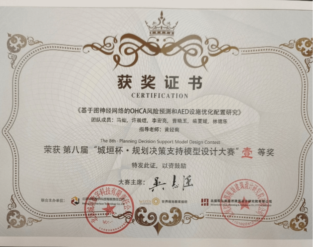 2024年7月6日,由北京城垣数字科技有限责任公司、世界规划教育组织(WUPEN)等单位联合举办的第八届“城垣杯·规划决策支持模型设计大赛”(简称“城垣杯”)的竞赛终评在北京举行。我院参赛师生获得好成绩。其中,黄经南教授工作室的马灿、李宏亮、曹晓玉联合其他科研机构同学的“基于图神经网络的OHCA风险预测和AED设施优化配置研究”获得一等奖。该项目将人工智能技术应用于深圳市的AED布局,相比传统方法,布局合理性有较大提升。詹庆明教授工作室陆亦潇,曲比阿呷莫与童安同学等共同完成的“基于多源数据的乡村旅游地吸引力评价模型”获得二等奖。