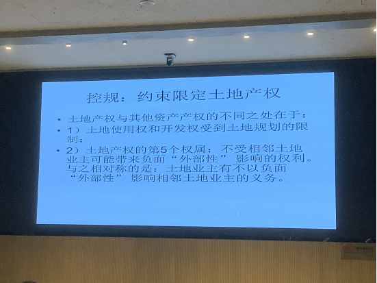 朱院士首先阐述了土地产权理论,从产权的定义类推,说明土地产权本质上由四个权利束组成:土地使用权、土地开发权、土地收益权和出让以上部分或全部权利束的权利。他以中国的土地产权制度为例做了解析,指出中国大陆的城市土地为国家所有,农村土地为集体所有。1988年,城市土地商品化废除了国有土地无偿使用的做法,实行土地使用权有偿出让的新政策,但这实际上是“有限期的私人土地拥有”,因为受让者在期限内拥有土地产权的四个权利束。