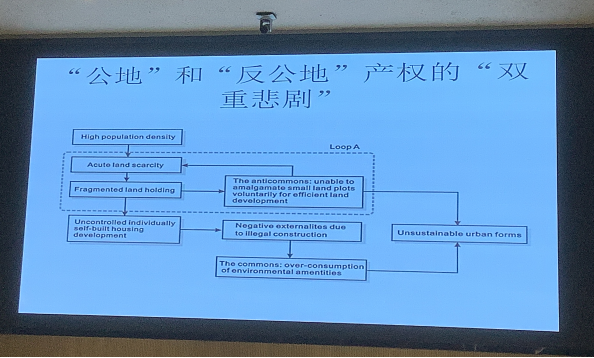 朱院士进一步通过上海、纽约等城市的实证分析指出,在高人口密度的背景下,城市土地资源非常稀缺,虽是以公平分配为出发点,但导致了土地划分细碎,而城市化发展下人口不断增长,因此房屋建筑面积匮乏,土地利用低效,从而出现租金昂贵或违章建设等现象。朱院士提到,从土地产权的角度来看,这些现象是在“公地”和“反公地”共存的情况下产生的,二者为土地产权制度优化的两个障碍。他详细阐释了“公地”与“反公地”现象:若一项资源(产)的产权没有被明确界定,没有被界定的资源(产)的价值会被置于“公共领域”,人们会无序地争夺这处于“公共领域”的价值,从而导致“租值耗散”和资源的低效利用,这种土地产权状况会导致“公地悲剧”。朱院士通过汕头城中村的数据具体展现了“公地悲剧”现象,汕头城中村容积率为2.95(代表土地经济效益),建筑密度高达60%(代表环境效益),而相同地段的商品房小区规划所规定的容积率是3.0,建筑密度为30%,可见经济效益和环境效益都未实现。反之,资源(产)被多个业主同时拥有,每个人都能排斥其他持有者的使用决定,因此业主间无法达成共识,土地难以(再)开发,导致土地资源停留在低效利用的状态,被称为“反公地悲剧”,对应的现实是“钉子户”现象。