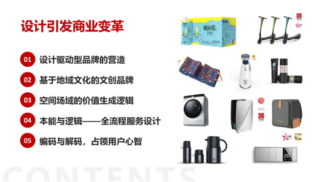 设计驱动产业创新由五点构成:1.构建产品和企业识别系统;2.为创新技术寻找应用场景;3.预设与感知——唤醒“古脑”的记忆;4.弹性系统与包容性设计;5.新能源与可持续,引领智能制造。丁伟详细地分析了他们之间的定义,并列举了多个实际设计项目作为案例,以辅助理解,形成了从理论到实践的系统理解。