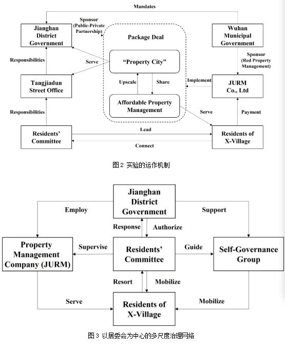 (内容简介)研究以武汉市西马新村小区的“物业城市”实践为实证案例(图1)。基于2019至2023年在案例地开展的田野调查与访谈,展示了案例地在建立可支付物业过程中的多主体、多阶段公私合作:政府以一揽子交易的形式完成了物业服务的尺度上升(upscale),包括以街道办为单元对碎片化的老旧小区物业供给的纵向整合,以及与服务于城市公共空间的“物业城市”供给的横向整合(图2),由此实现资源配置重组,改善老旧小区物业供给的可支付性。研究进一步探讨了治理实验中政府-社会关系的演化,认为围绕物业供给形成的多尺度治理网络强化了政府对社区基层的领导(图3)。与住房私有化改革以来门禁商品房社区的情况不同,物业服务重建而不是弱化了老旧小区中居民与政府的联系。该实验具有“政府企业家主义”特征,政府通过调动市场工具、收编社会力量来实现上述非经济目标。